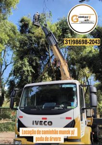 Poda de Árvore com Caminhão Munck A poda de árvores em altura precisa ser feita com segurança e o equipamento